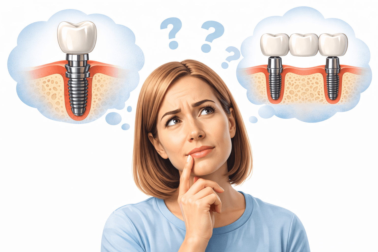Имплант предпочтительнее, если соседние зубы здоровы: мост требует их обточки и не останавливает атрофию кости. Мост допустим как компромиссное решение при недостаточном объёме кости или экономических ограничениях.