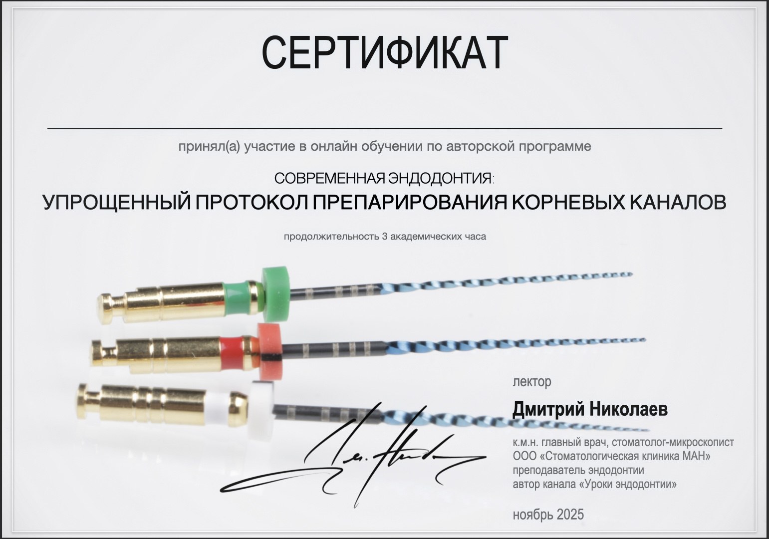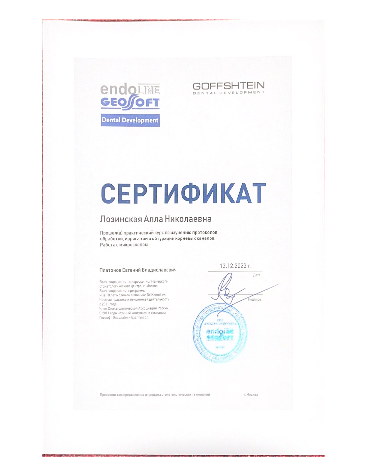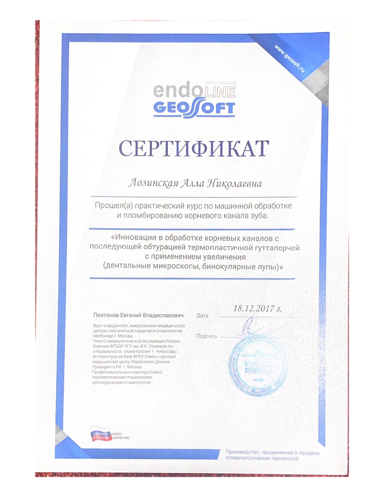 2017 г. — прошла курс Инновации в обработке корневых каналов с последующей обтурацией термопластичной гуттаперчей с применением увеличения( дентальные микроскопы,бинокулярные лупы)